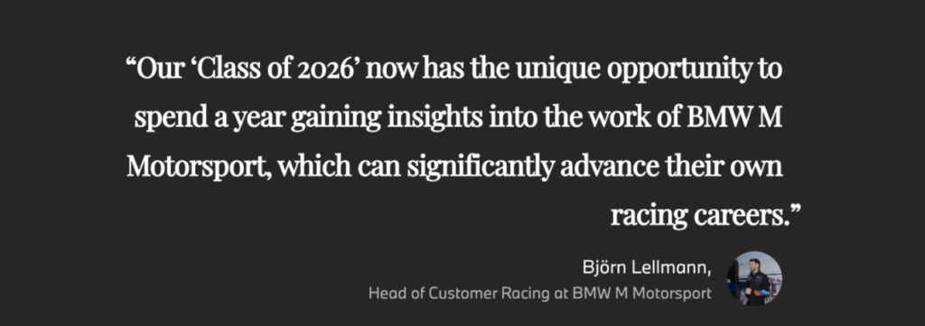 Following the successful completion of the “Class of 2025,” which consisted of Berkay Besler (TUR), Nerea Martí (ESP), Matt Million (USA), and Niels Tröger (GER), a panel of experts and BMW M works drivers from BMW M Motorsport set about assessing the candidates for the second round of the BMW M Racing Academy. Twelve young talents who want to drive the BMW M4 GT4 in the upcoming customer racing season were shortlisted for the “Class of 2026”. The group of young talents was selected from a large number of applicants and came together in Munich in October 2025 to undergo further demanding tests, at the end of which the best three participants were selected for the “Class of 2026”.